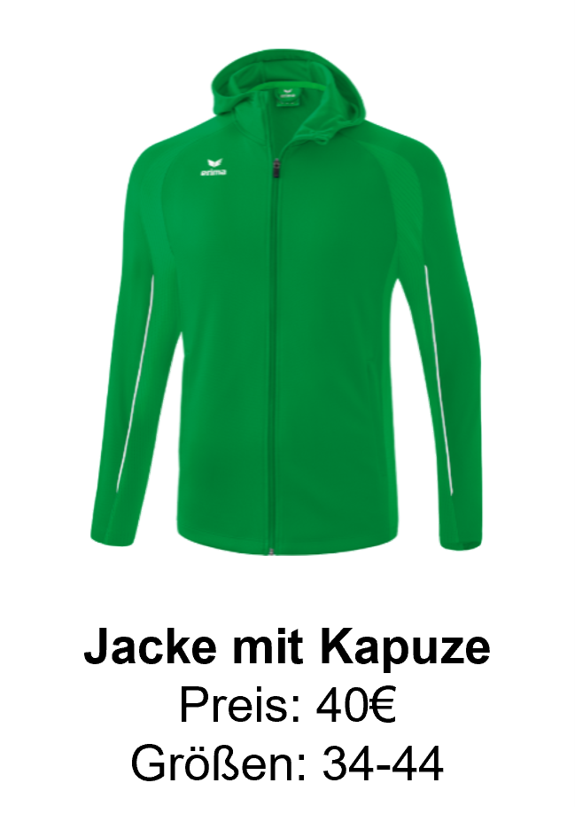 Ihr möchtet ein Kleidungsstück bestellen? Dann schreibt eine Mail an info@tc-gruen-weiss.de, nennt euren gewünschten Artikel und eure Größe.